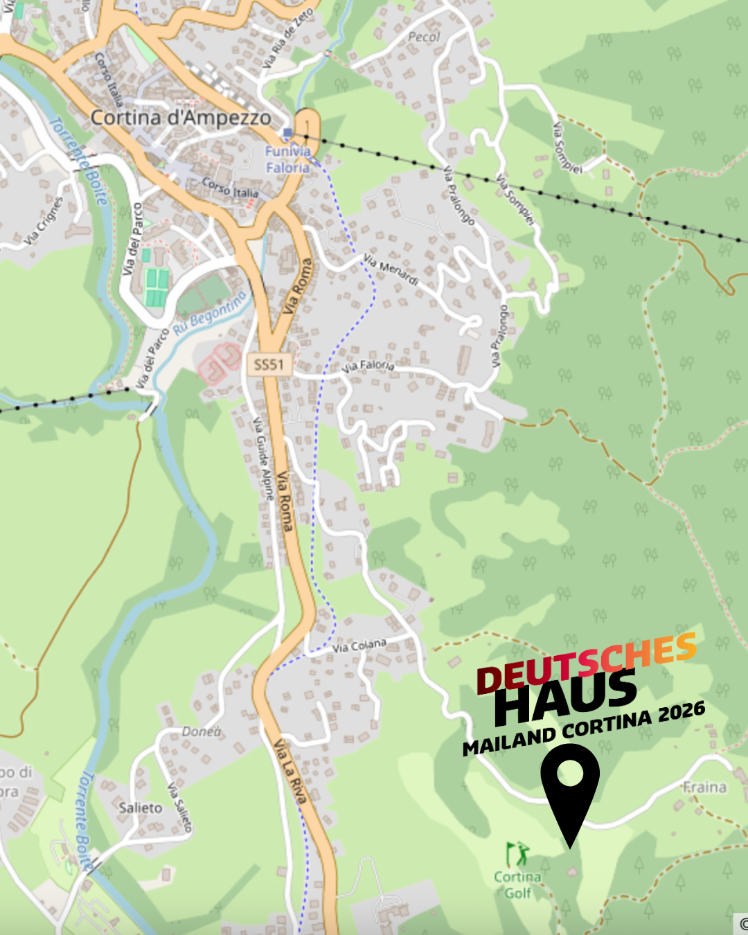 Die Adresse für das Deutsche Haus und die Team D Fan Zone lautet: Località Fraina, 14/15, 32043 Cortina d'Ampezzo BL, Italien.
