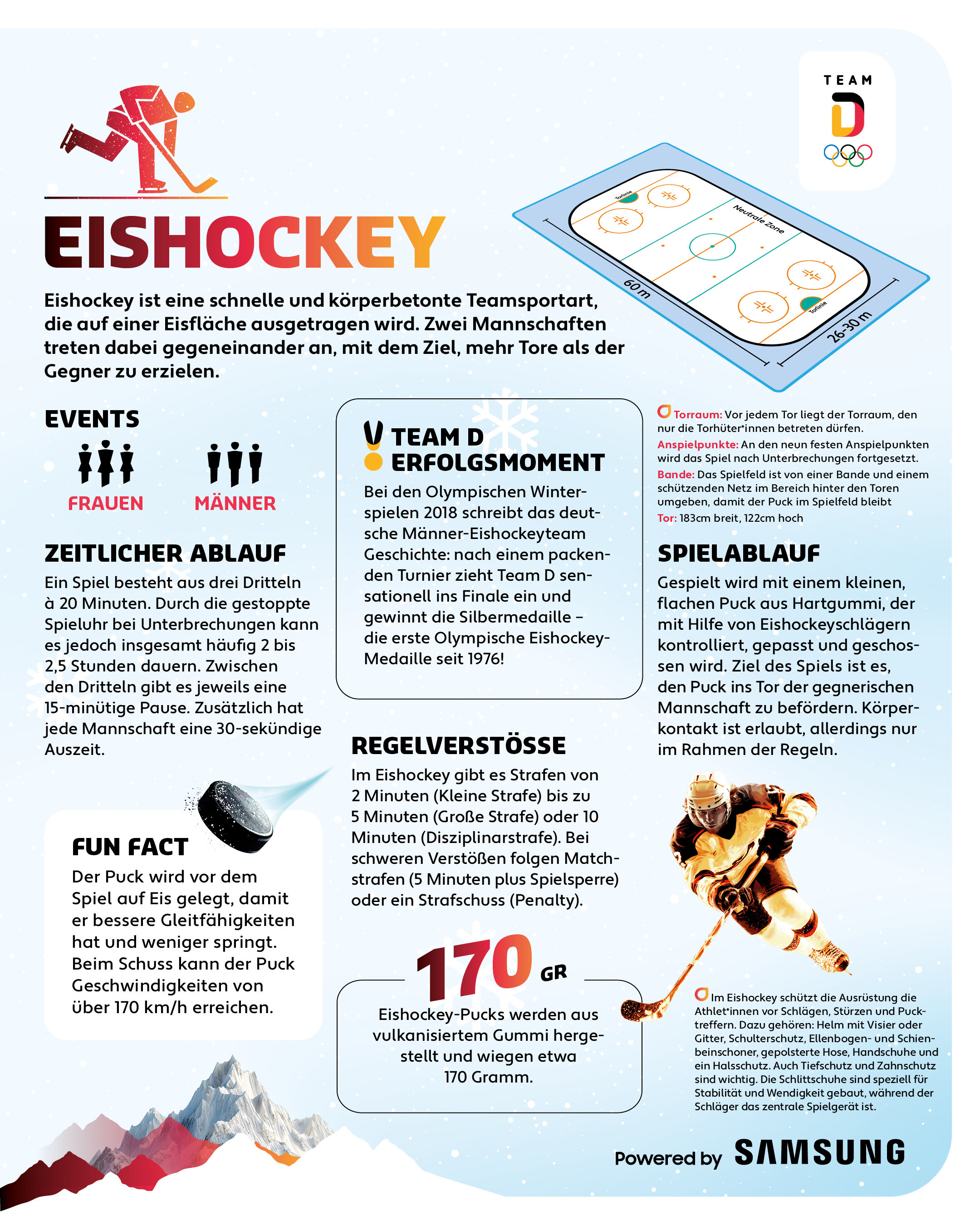 Die Spielzeit im Eishockey beträgt dreimal 20 Minuten, wobei die Zeit bei Unterbrechungen angehalten wird. Gibt es nach 60 Minuten keine Entscheidung, wird das Spiel um fünf Minuten verlängert. Fällt auch dann keine Entscheidung, kommt es zum Penaltyschießen. Die Teams bestehen aus einer Torfrau oder Torwart sowie sechs weiteren Spielerinnen und Spielern. Während der Begegnung kann unbegrenzt gewechselt werden.