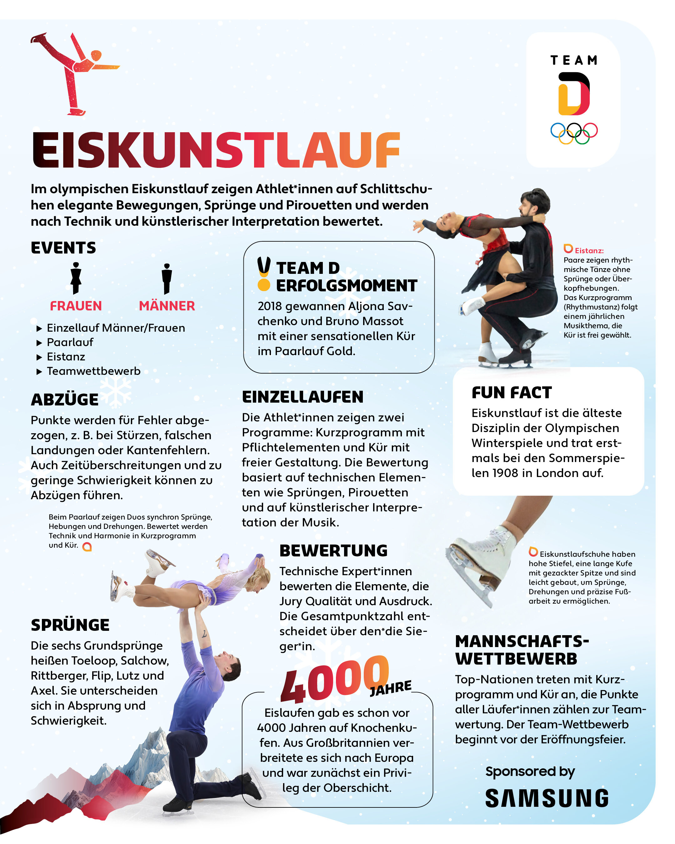 Der Eiskunstlauf ist der „Schöngeist“ unter den Wintersportarten. Künstlerischer Ausdruck, Grazie und Anmut gehören neben dem technischen Können zum Rüstzeug. Die Sportart ist die erste aus dem Winterbereich, die schon vor den ersten Olympischen Spielen 1924 ihre Premiere feierte. 1908 in London wurden bereits vier Entscheidungen ausgetragen, 1920 in Antwerpen waren es dann drei.