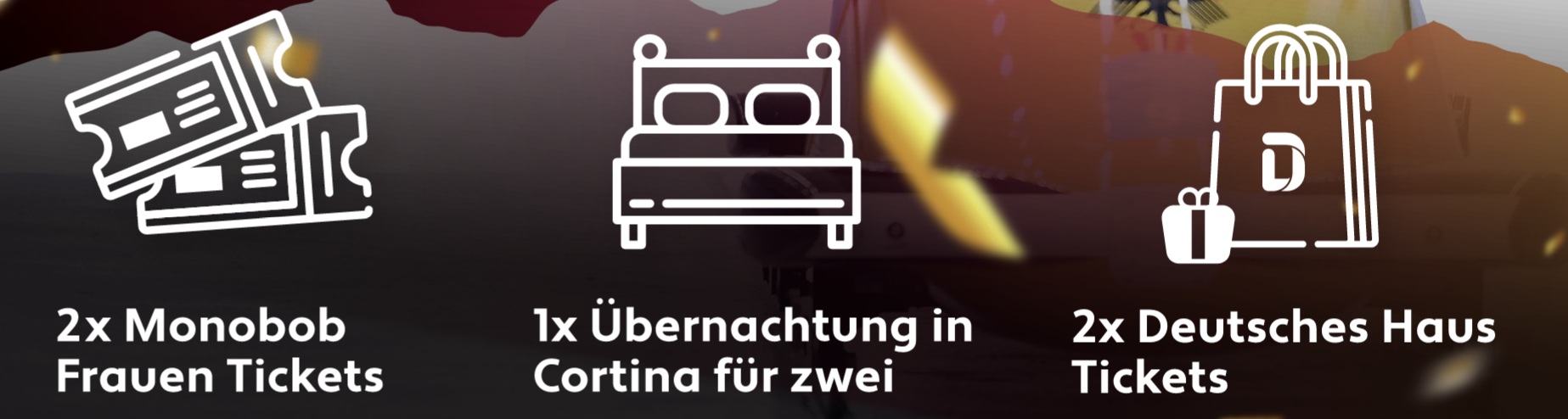 Wir verlosen 2 Tickets für die Medaillenentscheidung im Monobob der Frauen in Cortina d'Ampezzo inklusive Übernachtung für 2 Personen. Zudem gibt's den Eintritt ins Deutsche Haus on top, um bestenfalls die Medaillen mit Team D zu feiern. Mehr Team D und Olympia kann man nicht erleben!