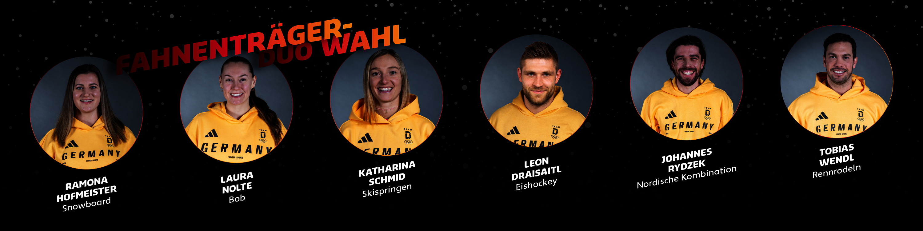 Der Deutsche Olympische Sportbund (DOSB) hat sechs Kandidat*innen – drei Frauen und drei Männer – aus dem Team Deutschland für die Wahl zum Fahnenträger*innen-Duo vorgeschlagen und ruft nun gemeinsam mit den Medienpartnern ARD, ZDF und Eurosport ganz Sportdeutschland auf, seine Stimme abzugeben.
